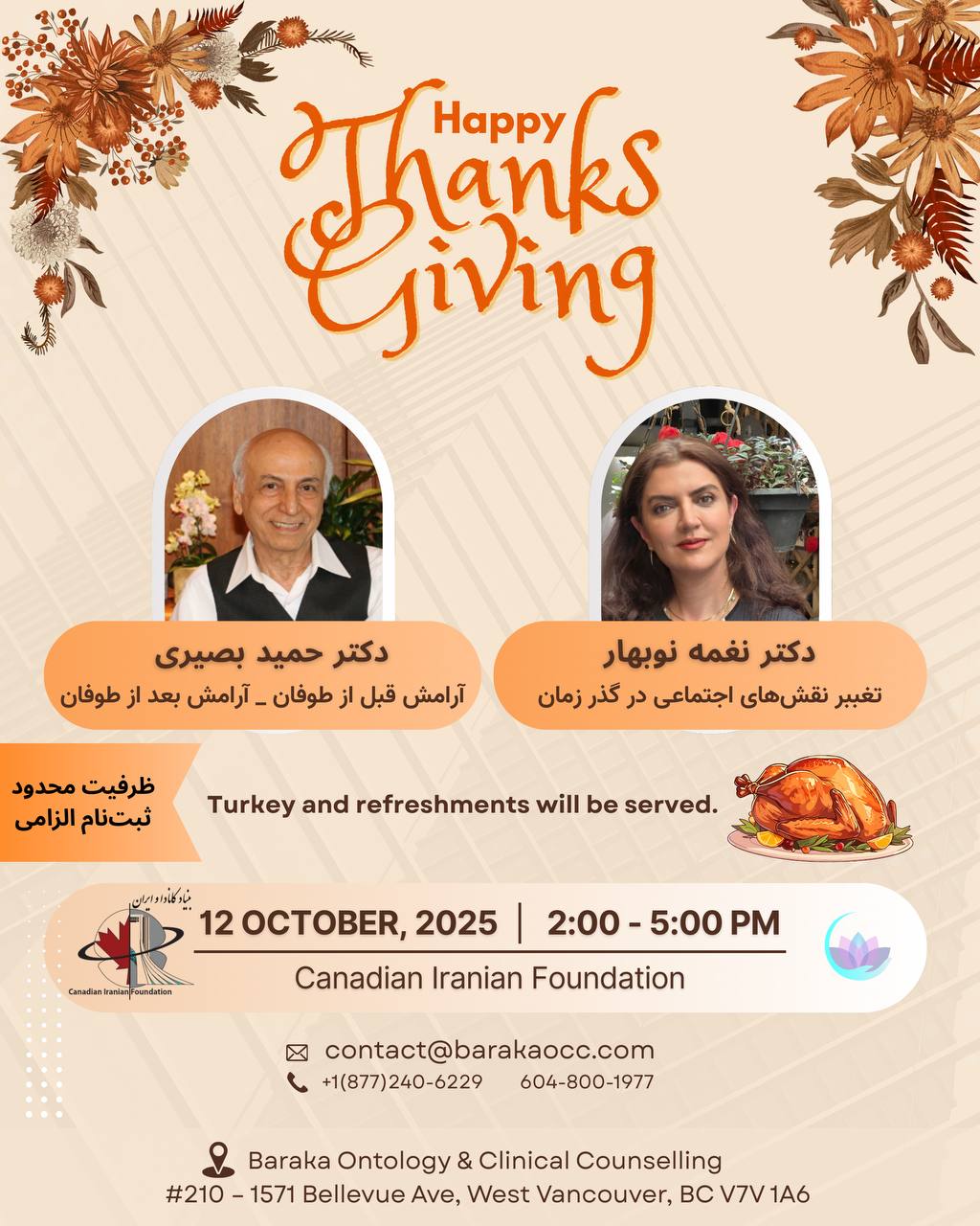 Join us for a warm and joyful Thanksgiving Celebration on Sunday, October 12, 2025, from 2:00 PM to 5:00 PM, hosted by the Canadian Iranian Foundation at Baraka Ontology & Clinical Counselling.